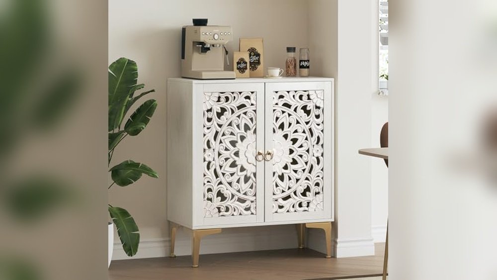 The JOINICE White Boho Accent Cabinet is a compact storage solution designed to fit perfectly in small dining rooms and tight spaces. With its clean white finish, intricate mandala carved doors, and gold metal legs, it brings a modern yet artisanal feel to your home. This cabinet works well as a dining room sideboard, coffee bar, or entryway table, offering a blend of style and function without overwhelming your space.